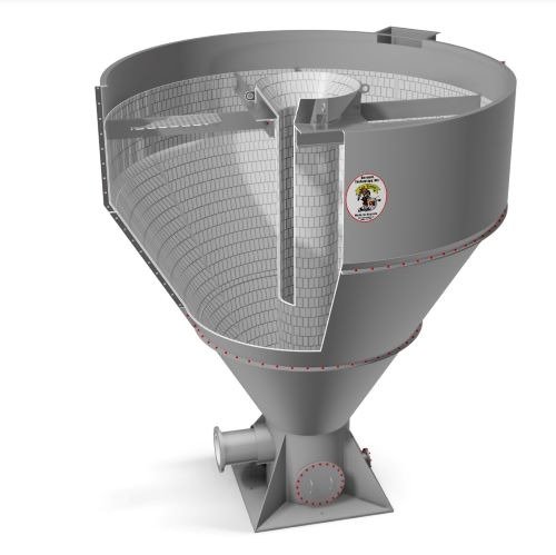 Our custom designs range from 4 ft. (350-400 TPH) to 10 ft. (1500-2000 TPH) in diameter. All exposed wear areas are lined with ceramic and can withstand as much as 3" raw feed material or as little as 300 mesh feed material, splitting equally to all discharge points.